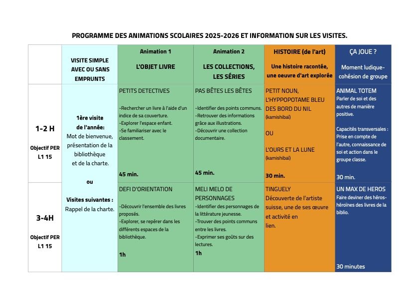 Les visites de classes sont planifiées avec les professeurs sur un créneau horaire précis. Cependant, les enseigant-e-s qui souhaitent effectuer une autre visite avec leur classe sont prié-e-s de contacter la bibliothèque pour trouver un autre horaire. Les élèves peuvent se rendre à la bibliothèque pour prendre et/ou rendre des livres durant les heures d’ouverture au public.